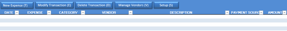The suggested vendor column will autofill once it finds vendors matching the description you copied in column C. If not, you will want to setup the vendors using the setup button on the right of the page and click on manage vendors from where you can add, modify, and delete vendors. Once vendors are setup and all the suggested vendors are filled, click on the next button which is to Apply Names. This will fill the vendor column. After this is done you are ready to click on Copy Expenses. This will now move your transactions into the All Transactions tab. We focus on this tab next to go over how to manually enter transactions.