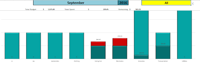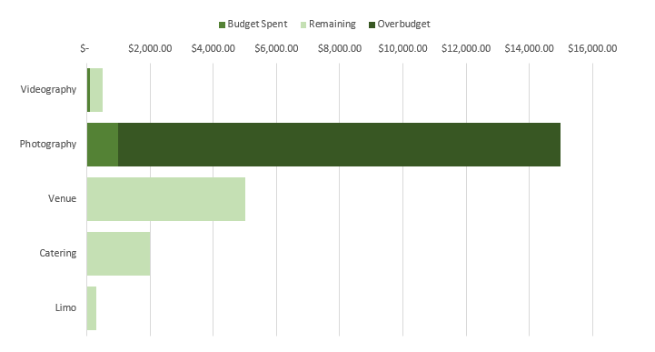 See above for the sample categories, and the chart below summarizes the data visually to show how much of a budget remains, how much has been spent, and how much is overbudget.