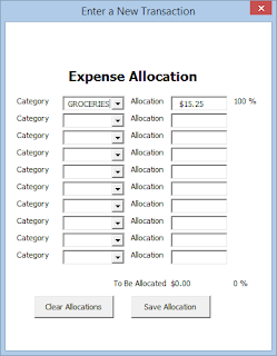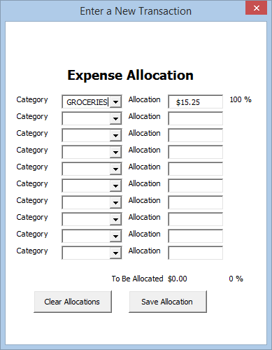 Additionally, you can change the allocation. When setting up a vendor you assign a default category. However in this template you can break out a line item into as many as ten different cost categories. For example, if you go to a department store it may not be as simple as saying all those expenses relate to groceries, clothing, baby items, electronics, or whatever else is sold there. You could have all those cost categories and more in one receipt. This is where you can break out that detail, by clicking on the Change button next to the category drop down.