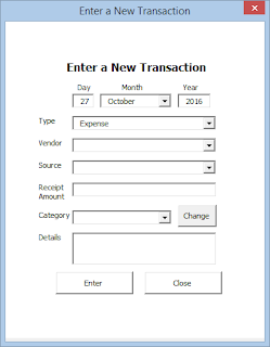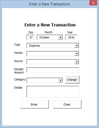 You can also modify existing transactions by clicking on the Modify Transaction button on the same tab which is the same screen as the new expense screen (see below) except filled out with the selected transaction’s details.