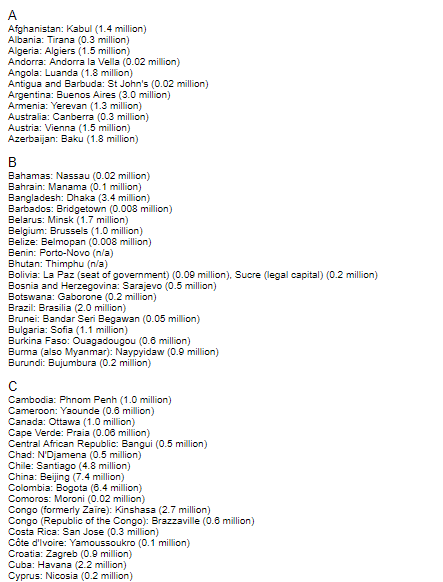 It copies in much the same as how it looked on the webpage. The problem is it is not in a format that you can do any analysis on. The structure it currently follows is Country: City (population). The more consistent the data is, the easier it is to pull the information out. In this sample, there are some inconsistencies but for the most part, it follows a logical pattern.